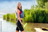 a young girl with an oar and in a life jacket is ready to go kayaking