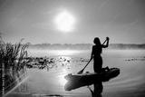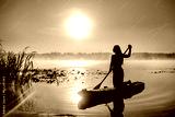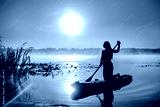 Silhouette of a woman on an inflatable SUP board at dawn and the horizon with mists on the water, atmosphere of relaxation
