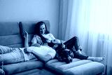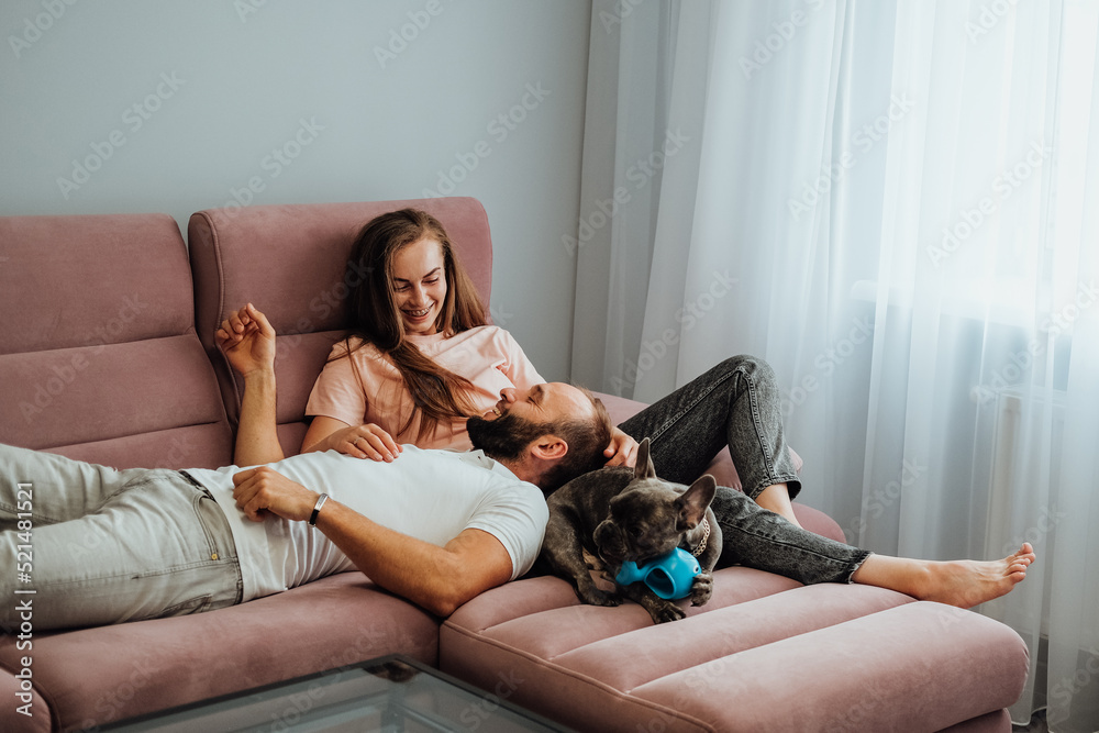 Adult Couple Having Leisure with French Bulldog at Home, Cheerful Woman and Man Relaxing on Pink Sofa with Pet