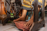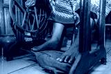 Close up view of a woman's legs while working on an old mechanical sewing machine