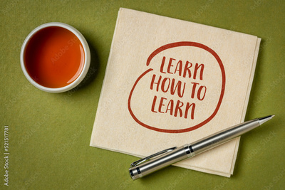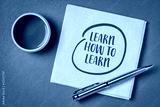 learn how to learn inspirational note note on a napkin with a cup of tea, education and personal development concept