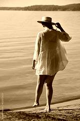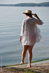 a girl in a white transparent sleeve and in a straw hat looks into the distance on the shore of a reservoir