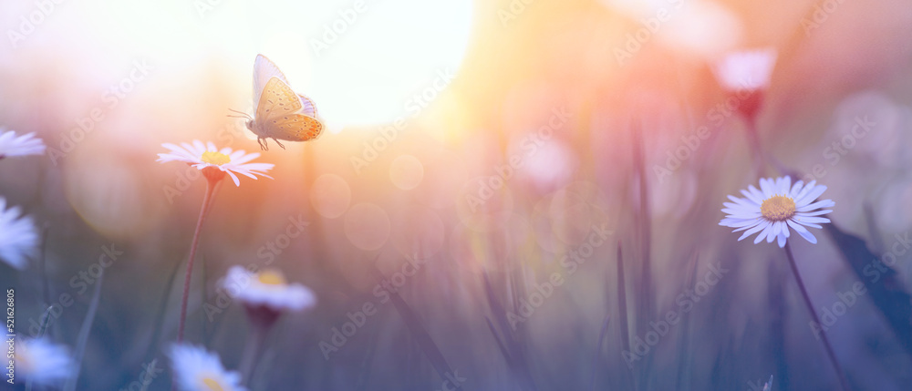 A Beautiful white flowers and butterfly in sunrise in a forest meadow close-up in sunlight in nature. Summer flowering landscape.