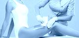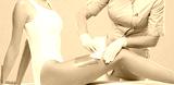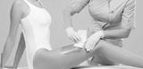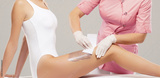 Beautician is removing hair from young female body and legs with hot wax. Woman has a beauty treament procedure. Depilation, epilation, skin and health care concepts.