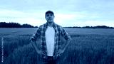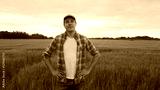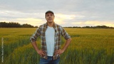 Farmer in front of a sunset agricultural landscape. Man in a countryside field. Country life, food production, farming and country lifestyle.