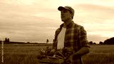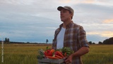 Farmer with a vegetable box in front of a sunset agricultural landscape. Man in a countryside field. Country life, food production, farming and country lifestyle.