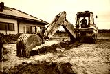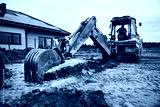 Excavator working at house construction site - digging foundations for modern house. Beginning of house building. Earth moving and foundation preparation.