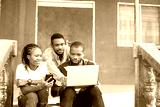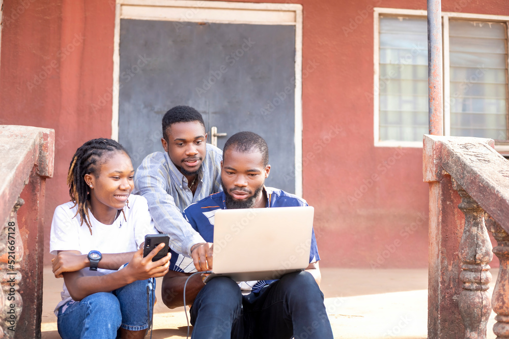 Group of learning millennial african american computer science students at university or college using laptop and mobile phone chatting online