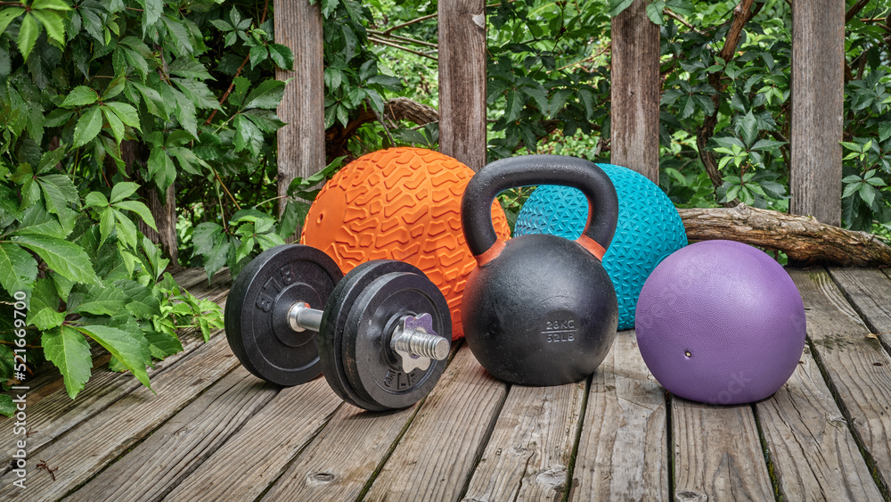 three heavy slam balls, iron kettlebell and dumbbell on a backyard deck, home and backyard gym concept