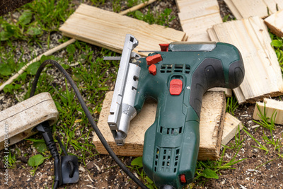 Electric jigsaw. Woodworking power tools. Wooden boards. Workshop.