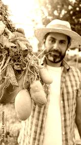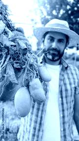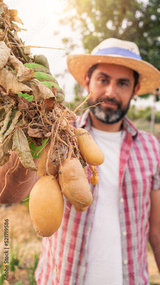 Organic vegetables. Fresh potatoes in the hands of male farmer. Cheerful man