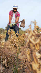 Farmer using hoe for picking potatoes in agricultural field. Agricultural farm.