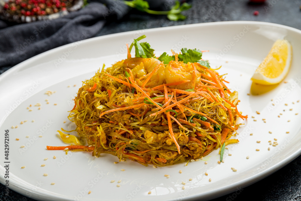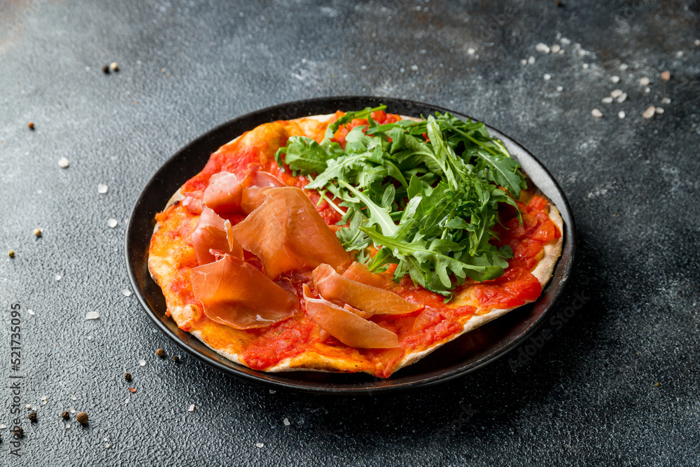 tortilla with jamon, tomato sauce and aragula on dark stone table