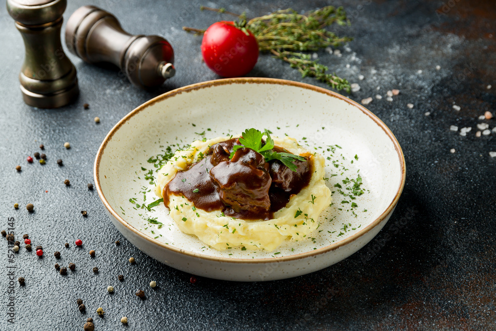 Beef cheeks with mashed potatoes and demiglass sauce on dark stone table