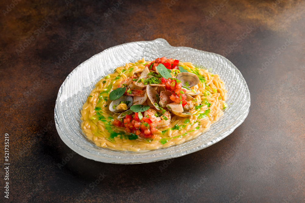 pasta orzo with seafood, sliced tomatoes and pesto sauce on brown table
