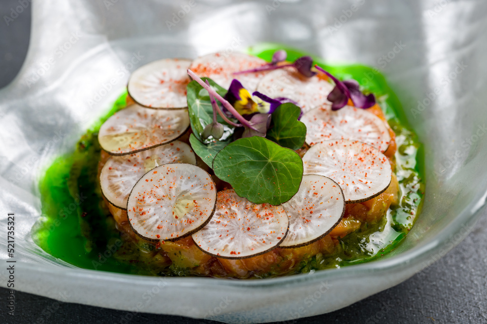 salmon Tartar with sliced radish on a plate on grey table