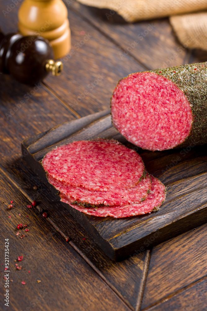 Sliced european sausage on the board on wooden table macro close up, vertical
