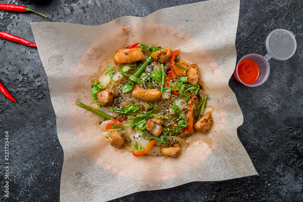 Rice noodles with chicken and vegetables top view on dark stone table