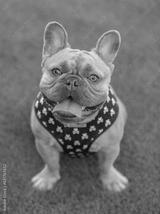 1-Year-Old Blue Fawn Male Frenchie Sitting and Panting with Tongue Sticking Out. Off-leash dog park in Northern California.
