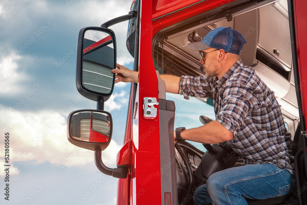 Truck Driver Adjusting Side Mirrors On Semi Truck