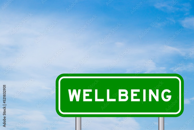 Green color transportation sign with word wellbeing on blue sky with white cloud background