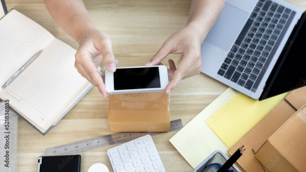 Man taking a photo of product in box postbox with a mobile phone, Identity verification or order confirmation, Business style for working at home, Working at home and owning businesses.