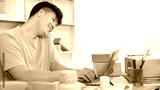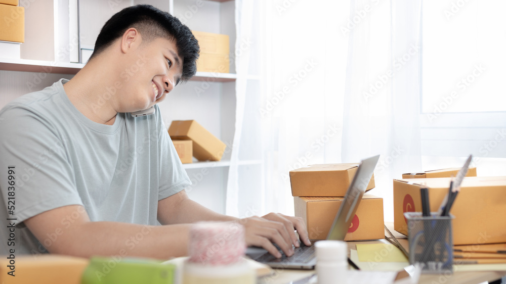 Man talking on the phone and typing on the computer chatting with customers who place orders online, Packaging on background, Sell online, Small business owner, Online shopping SME entrepreneur.
