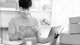 Man taking a photo of product in box postbox with a mobile phone, Identity verification or order confirmation, Business style for working at home, Working at home and owning businesses.