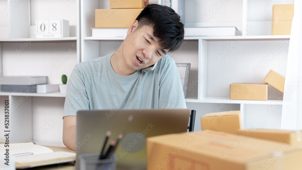Man talking on the phone and typing on the computer chatting with customers who place orders online, Packaging on background, Sell online, Small business owner, Online shopping SME entrepreneur.