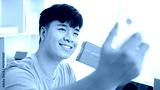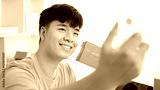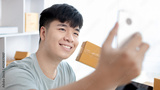 Man uses his phone to take pictures of himself with products or selfies, Identity verification or order confirmation, Business style for working at home, Working at home and owning businesses.
