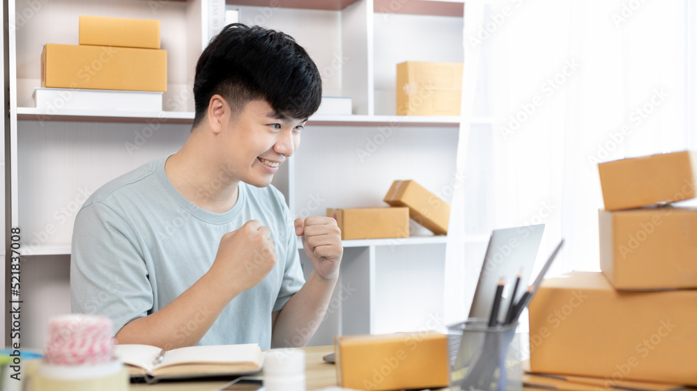 Man was happy after receiving an order from an internet customer, New business style for young people working at home and owning businesses, Online shopping SME entrepreneur, Packing box, Sell online.