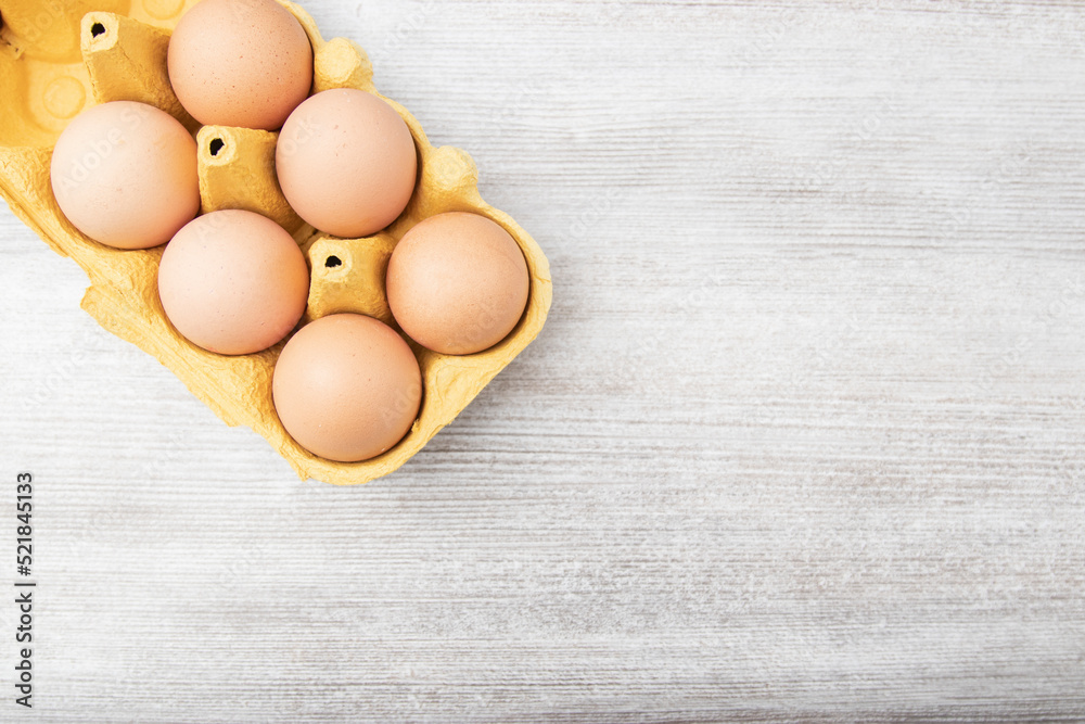 Large brown chicken eggs in yellowcarton packaging on wooden table. copy space