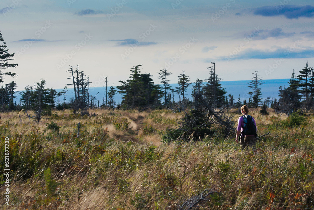 Young woman hiking on top of Skyline trail in Cape Breton Highlands National Park, Nova Scotia, Canada, by windy day