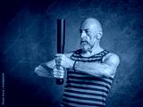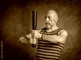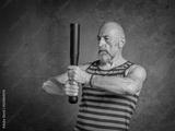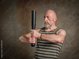 heavy fitness jump rope on rustic, weathered wooden backyard deck