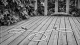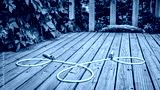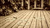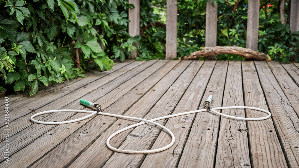 heavy fitness jump rope on rustic, weathered wooden backyard deck