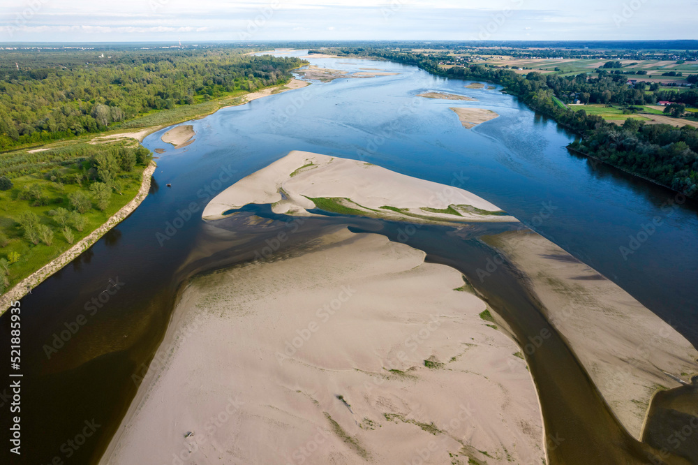 Wisła, największa polska rzeka. Widok z drona w okolicach Warszawy. Piękna rzeka i dzikie brzegi są wielką atrakcją i siedliskiem wielu gatunków zwierząt.