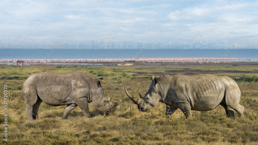 two wild rhino facing to fight at Lake Nakuru National Park Kenya