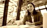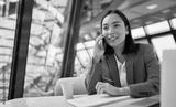 Young busy chinese business woman talking on phone working in modern office. Asian businesswoman company sales client manager wearing suit making call on cellphone sitting at workplace.