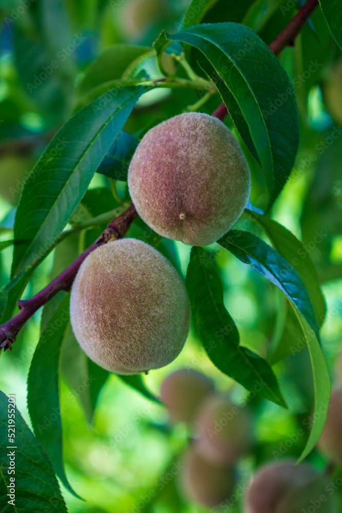 Ripening red fuzzy small peaches hanging on a peach tree branch with many green leaves in a spring or summer small local orchard in Poland in Eastern Europe