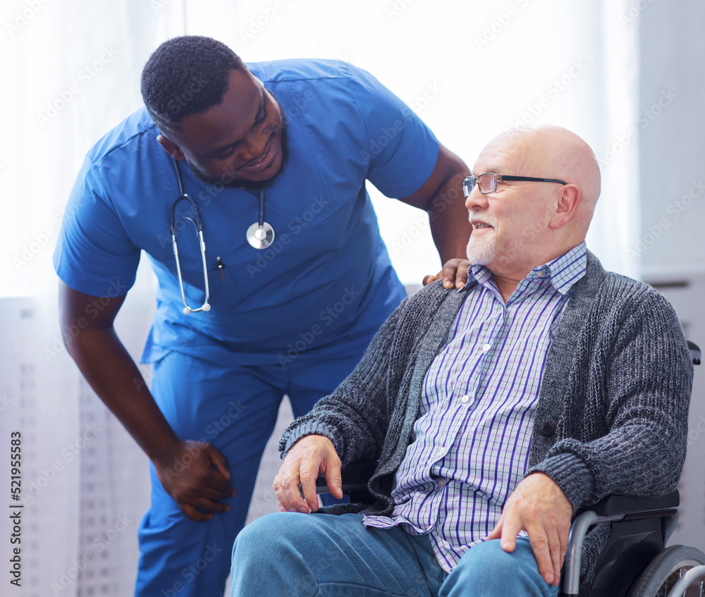 Professional doctor helps an elderly man with chronic diseases. Therapist and patient in home interior. Health care and medicine concept.