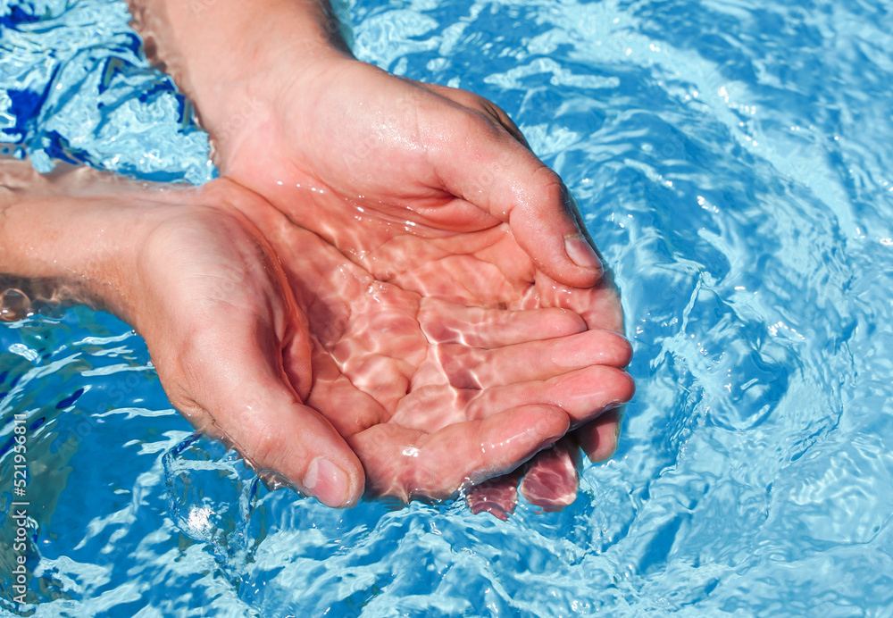 The hands cupped together submerged in clean clear blue water in swimming pool