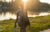 Young African American woman walking with bag and bottle of water through the park in a summer day