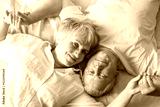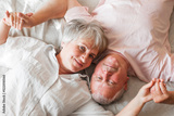 Happy elderly couple wakes up in bed in the morning
