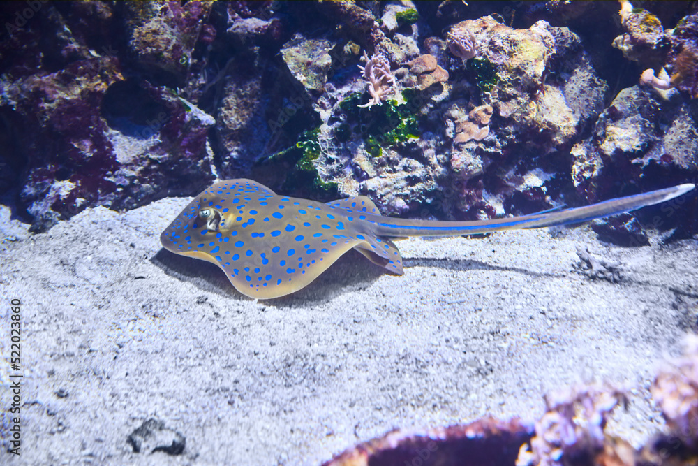 Beautiful blue spotted stingray on the reef, (Taeniura lymma).