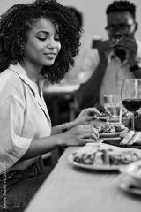 A Hispanic girl enjoys dinner in a restaurant with her friends.