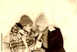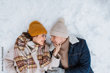 people, love and leisure concept - happy smiling couple lying on snow in winter