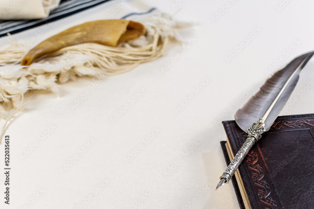 Religion image of Prayer Shawl - Tallit, Prayer book and Shofar (horn) jewish religious symbols. Rosh hashanah (jewish New Year holiday), Yom kippur concept.