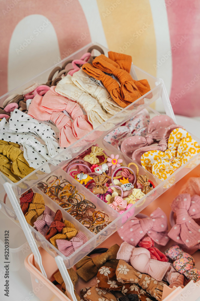 Organizer with fashion hair bows, hairpins and hair elastics on white table in Children's room. Nursery Organizing and Storage Ideas. Baby Girl hair accessory. Hairstyles for girls with bows.