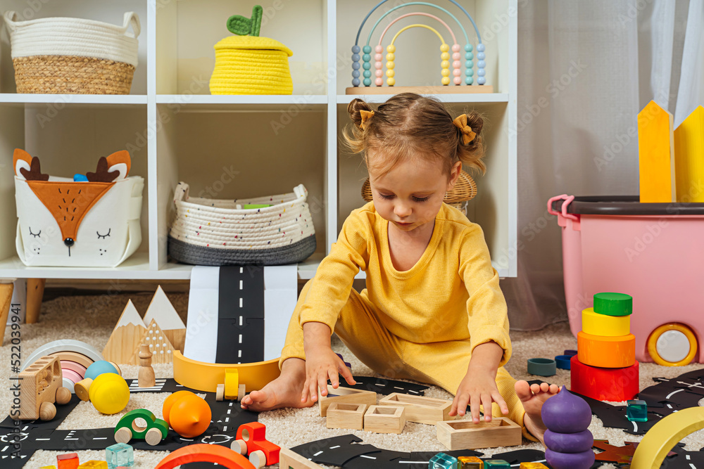A little girl sitting on floor plays with toy wooden blocks cars and road in playroom. Educational game for baby and toddler in modern nursery.