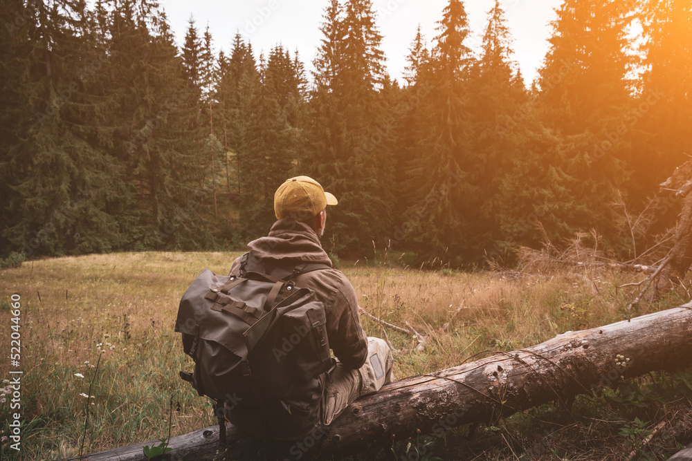 tourist sitting on a lumber in forest
